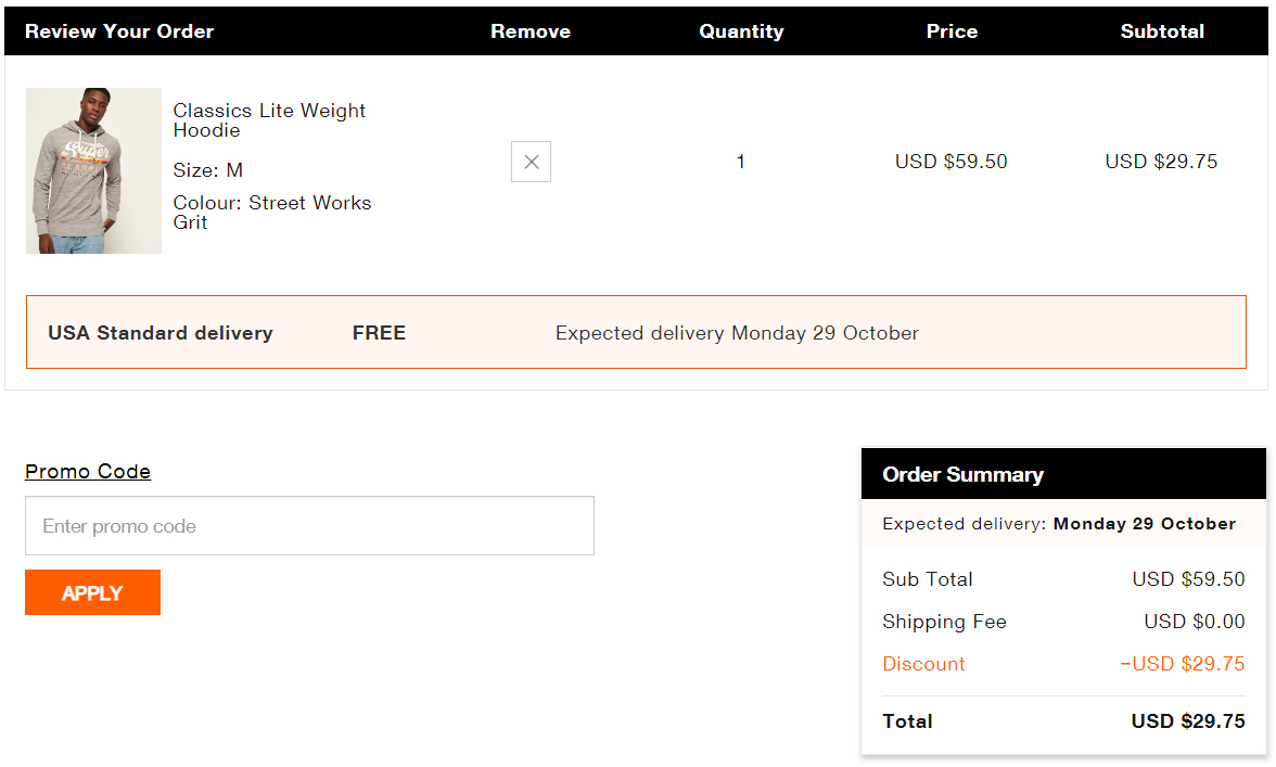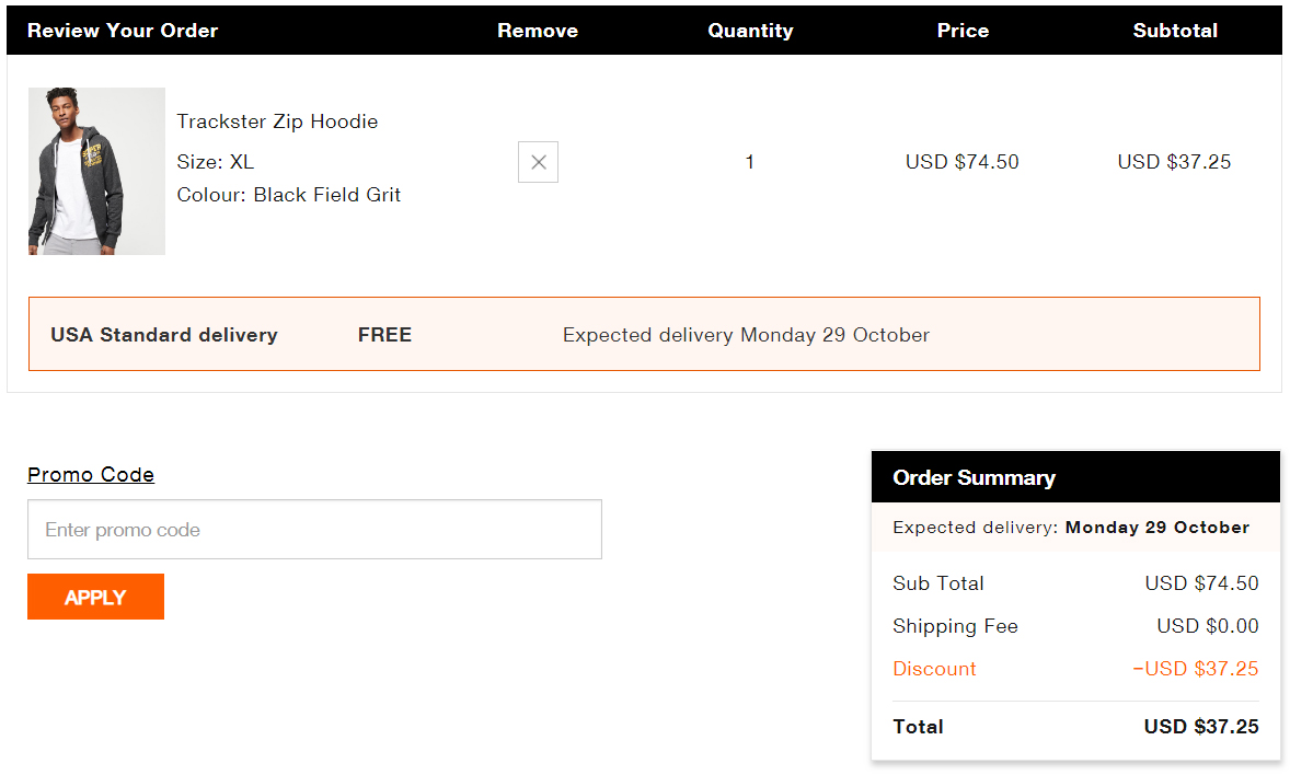 B仔實測 hoodies 一睇係$110美金,但一Check out 就係75再半價,只係$37.25 就買到,嘩,唔洗$300就買到件SuperDry Hoodies,抵到爛!