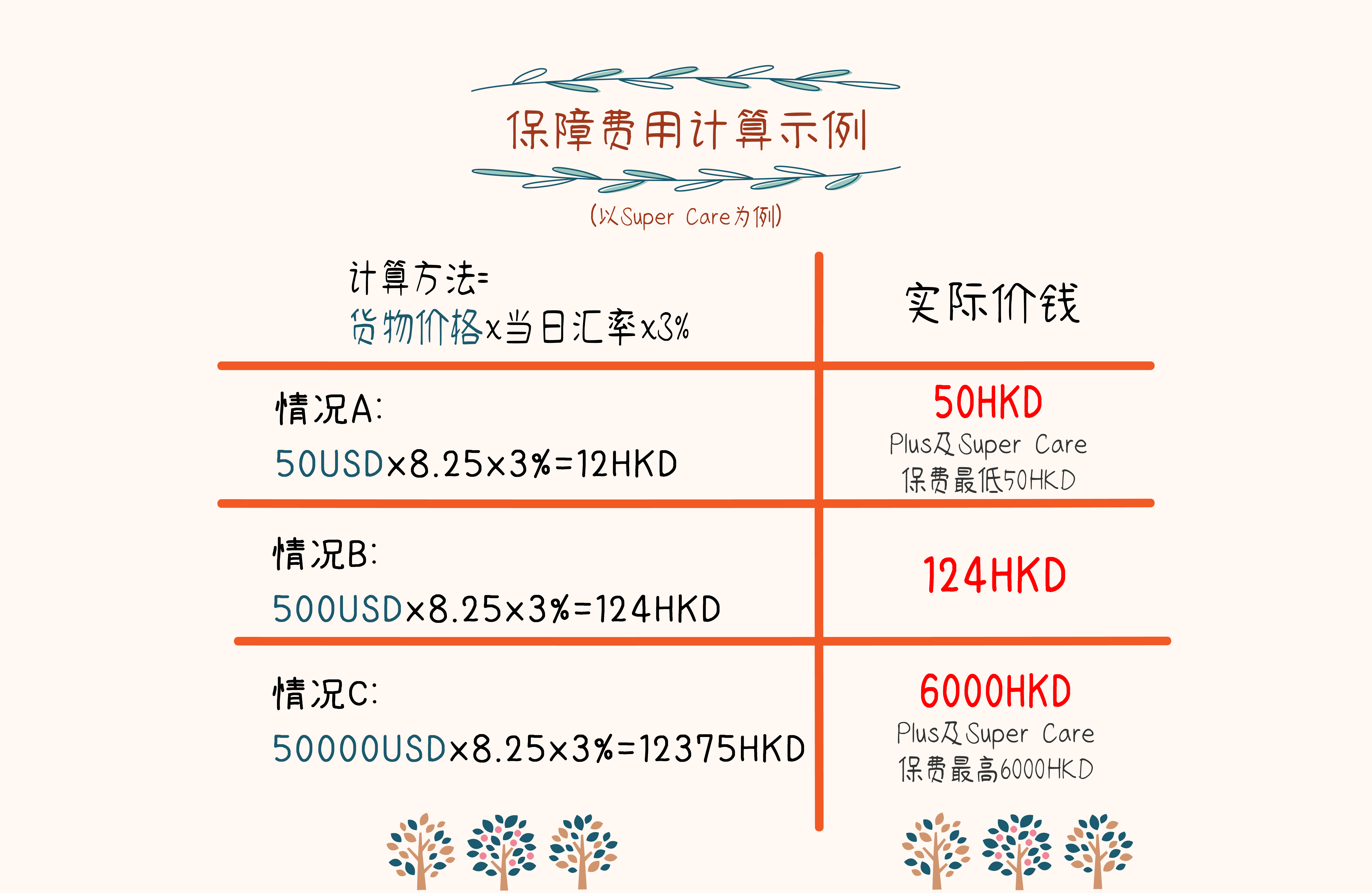 - 申报货件时可购买保障计划,以每个货件追踪编号 (Tracking Number) 独立计算,费用为货件申报价值的 2.5% Plus 或 3% Super Care,并按每日汇率 以港币计费,将连同运费一同收取(2.5% Plus 或 3% Super Care 最低收费为 HK$50); Basic 收费为HKD$20。
